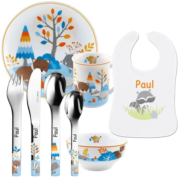 - 8-Teiliges Geschenkset: Puresigns Kinderbesteck mit persönlicher Gravur des Namens, Porzellan Kindergeschirr (Teller, Müslischale, Tasse) + 1 x Lätzchen mit Namen des Kindes. Lieferung in Puresigns Geschenkbox.