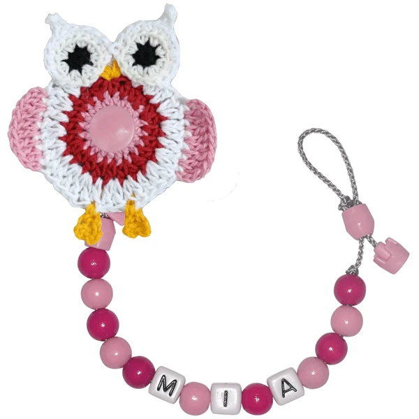 Schnullireich Schnullerkette mit Namen Häkel-Eule Rosa